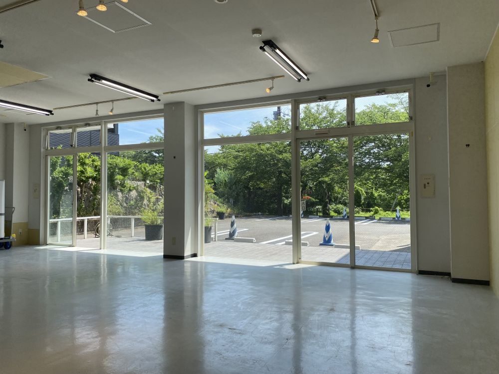 さくら並木のメイン通りを東側に見る立地で メイン部分はすべて開口部で一面ガラス張りになります リフォームされたオフィス内は土足でOK!